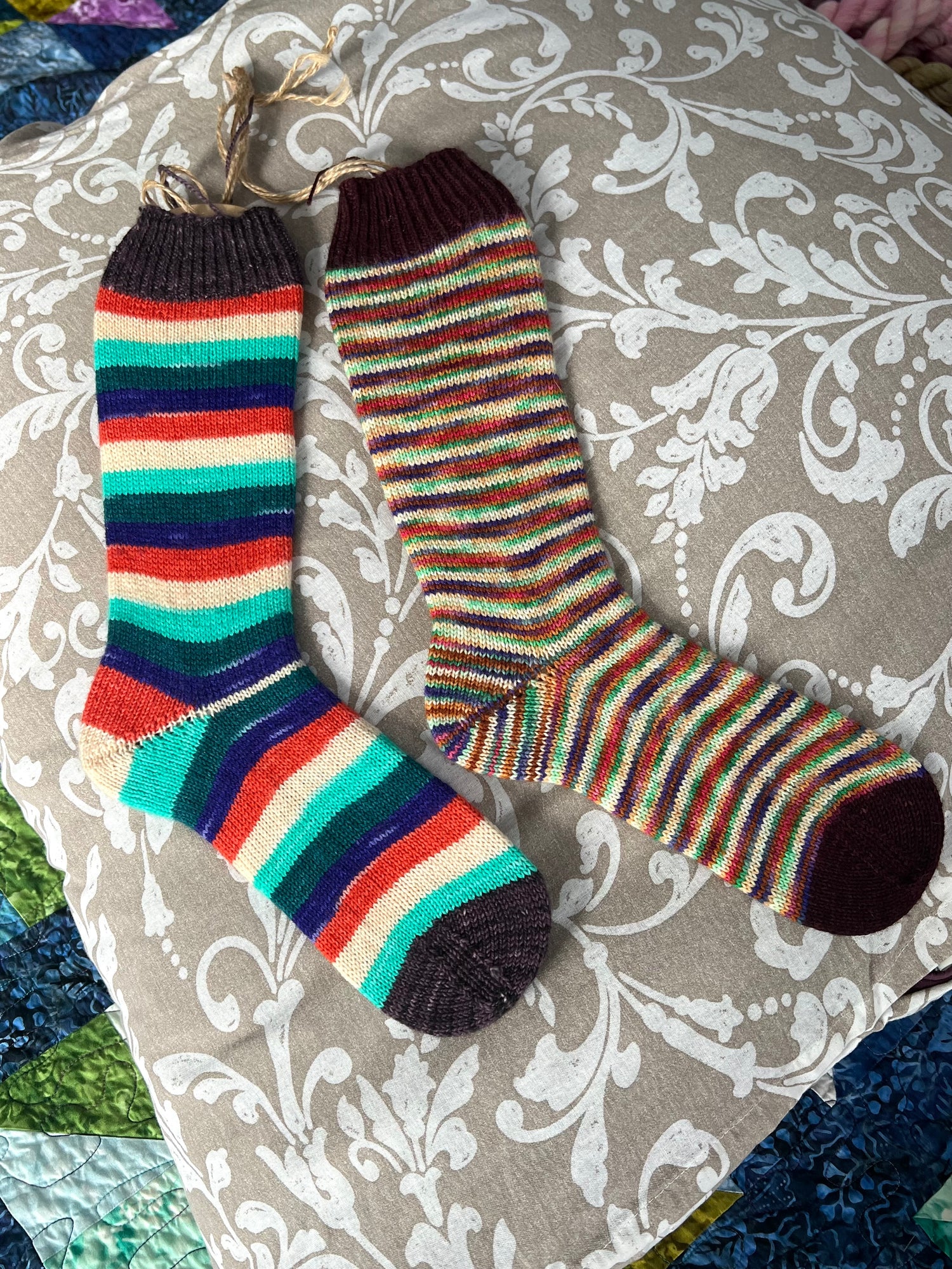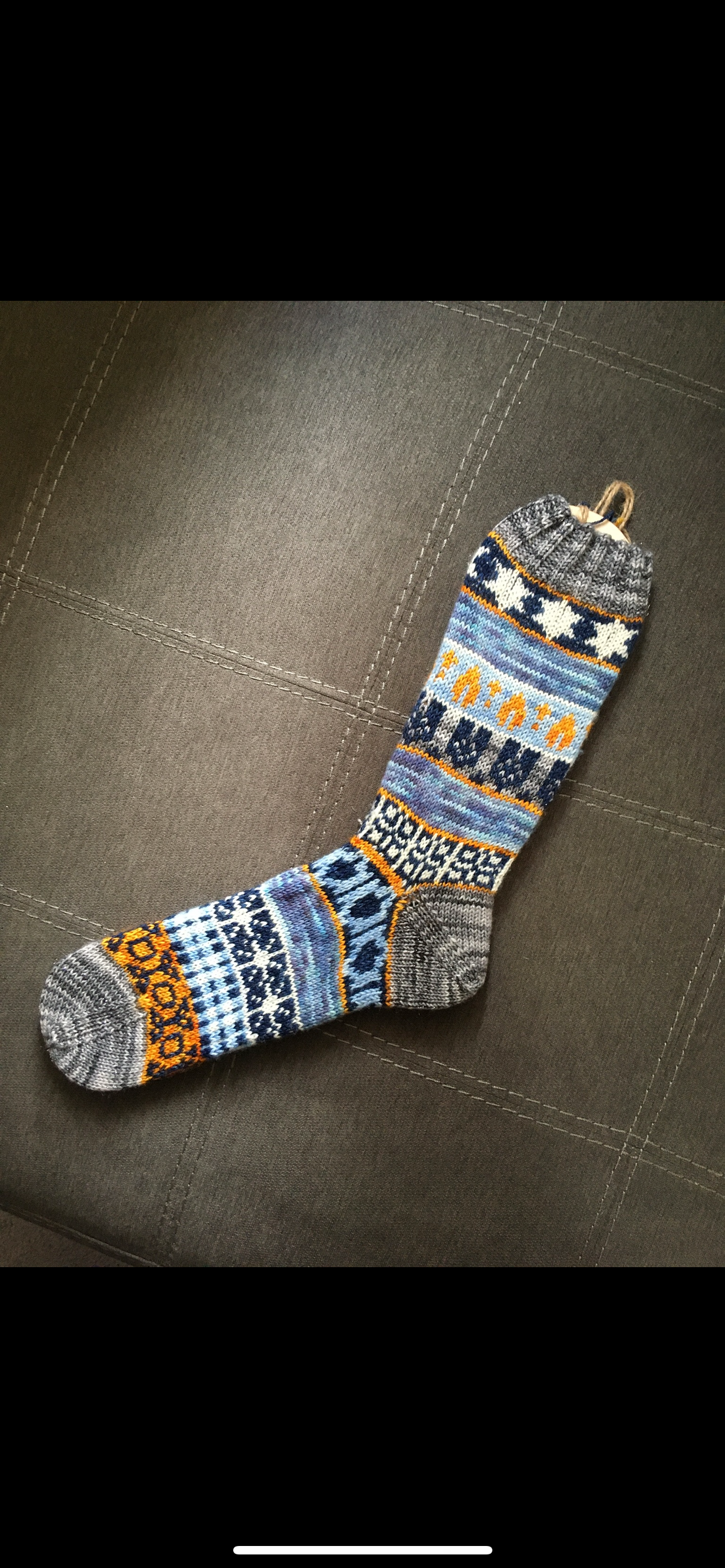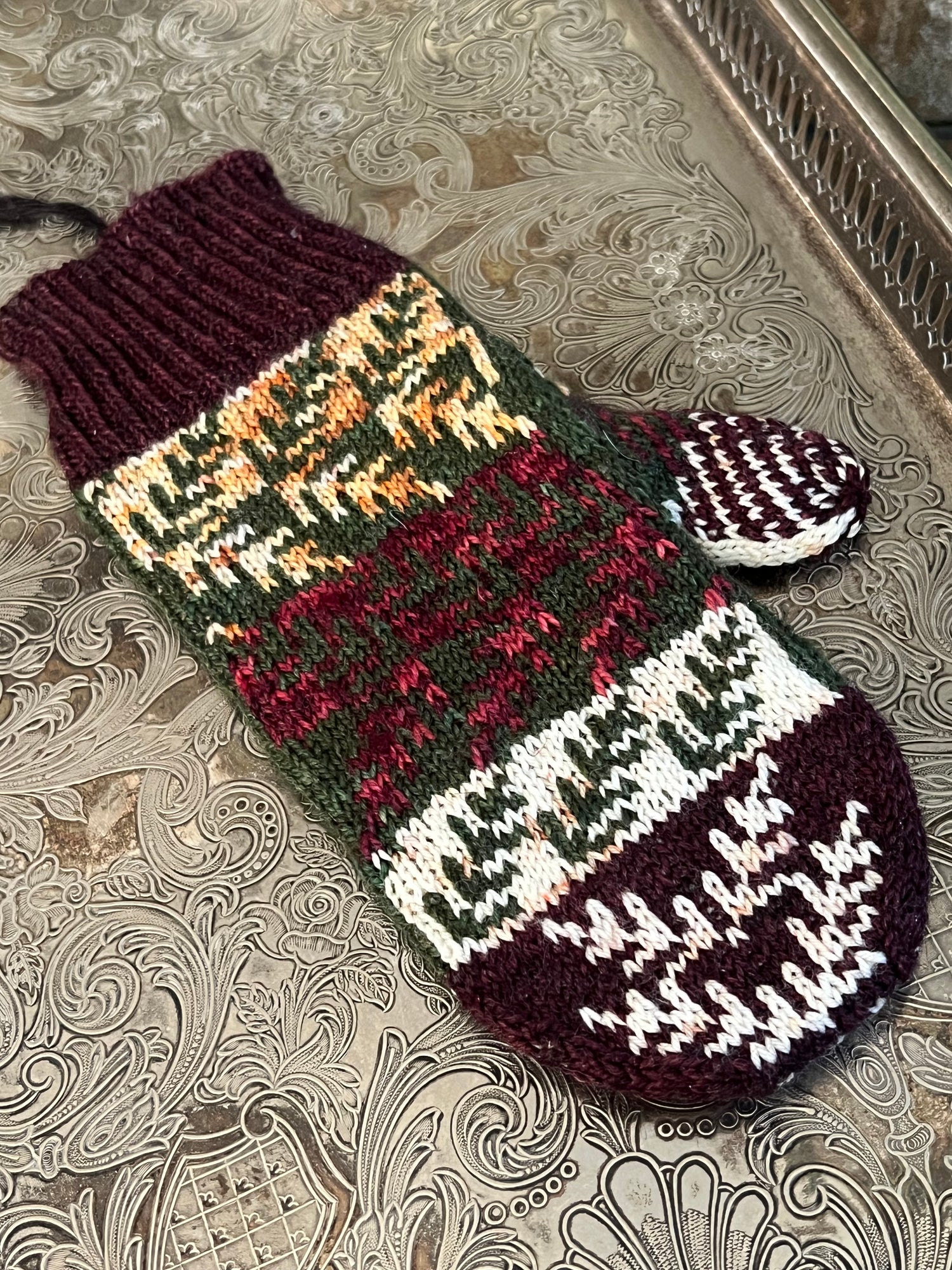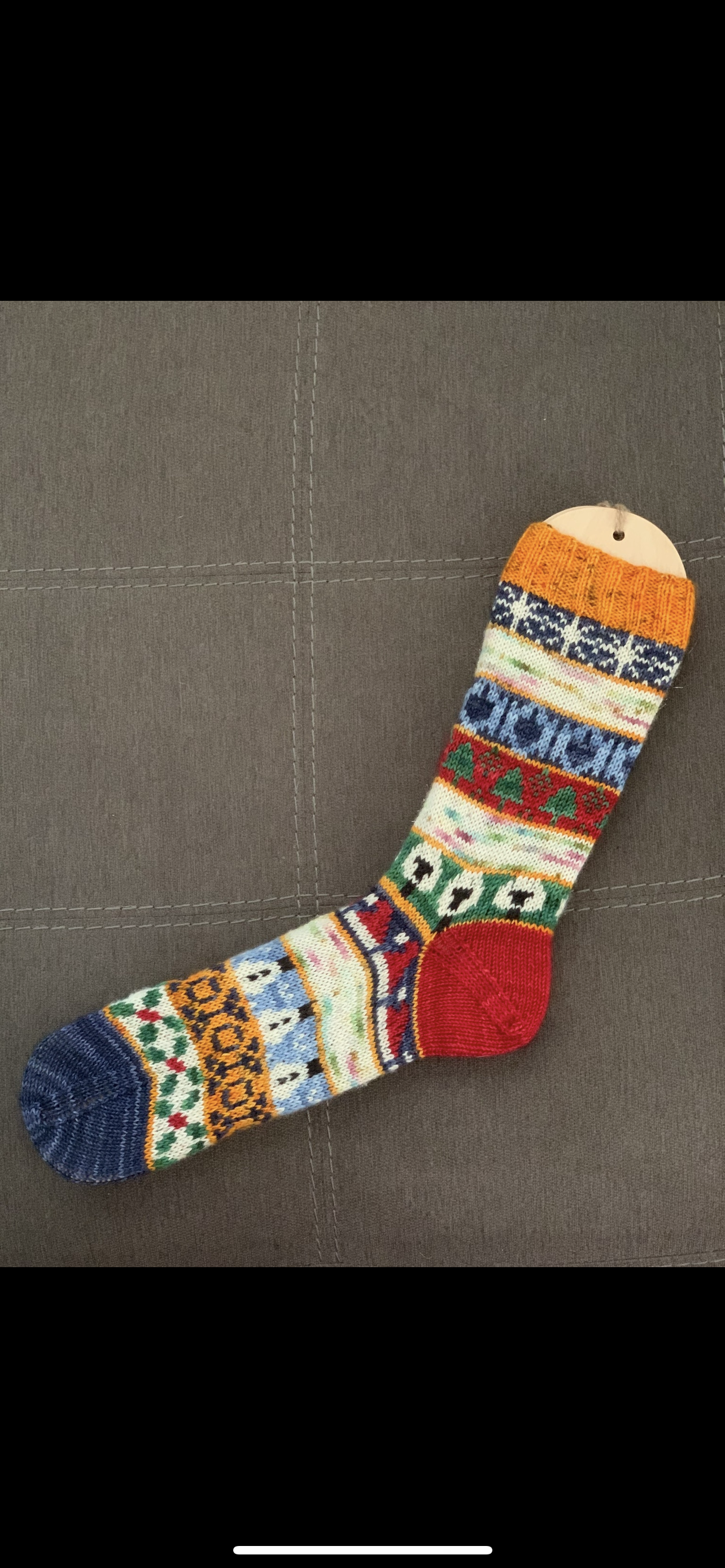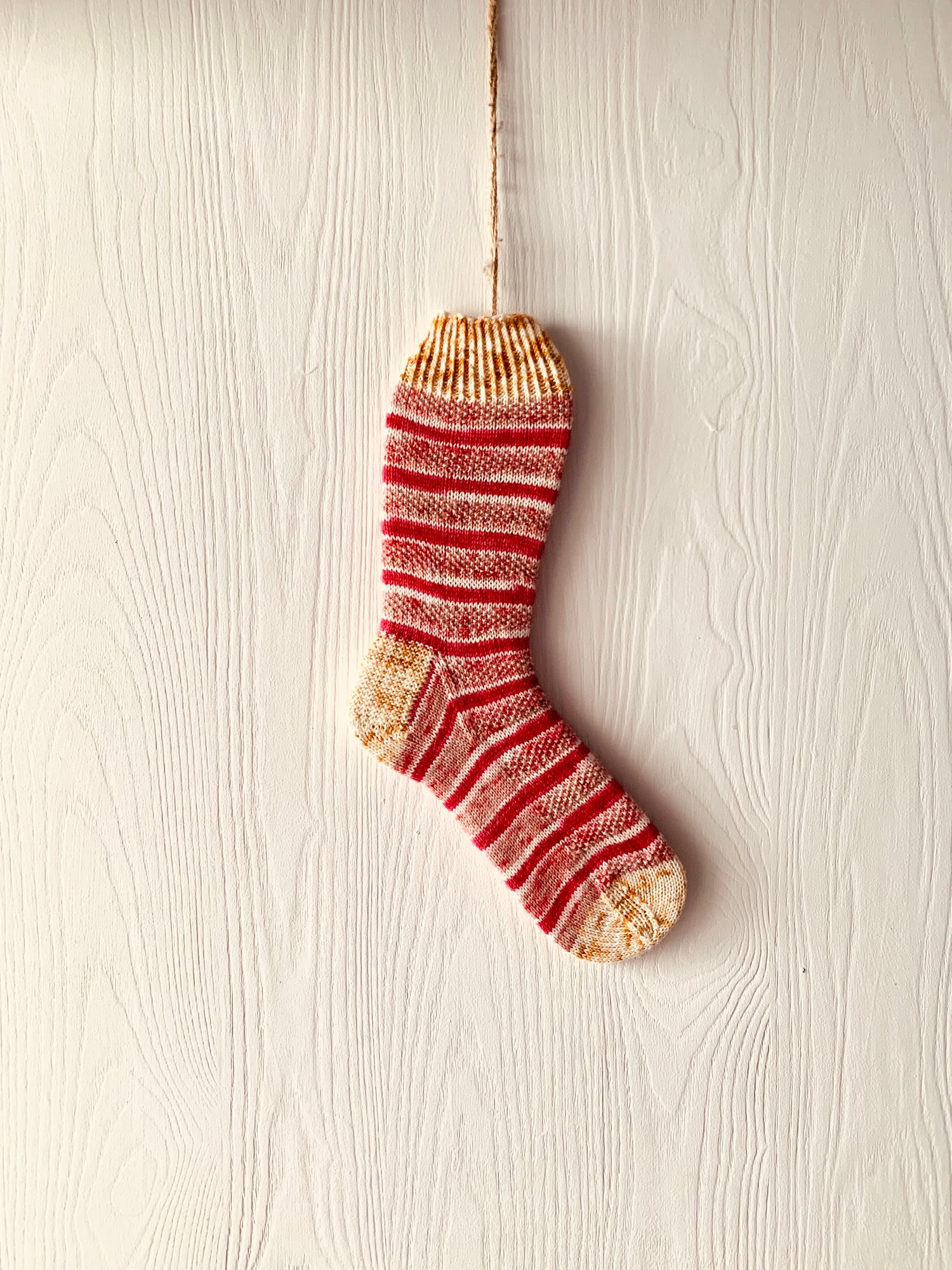 Celebrating the 8 nights of Hanukkah, this sock was inspired by the menorah sitting on a table with the Star of David above and all the gifts, gelt, and dreidels on the table beneath. A beautiful time of family and togetherness can only be made better by a few pairs of these!