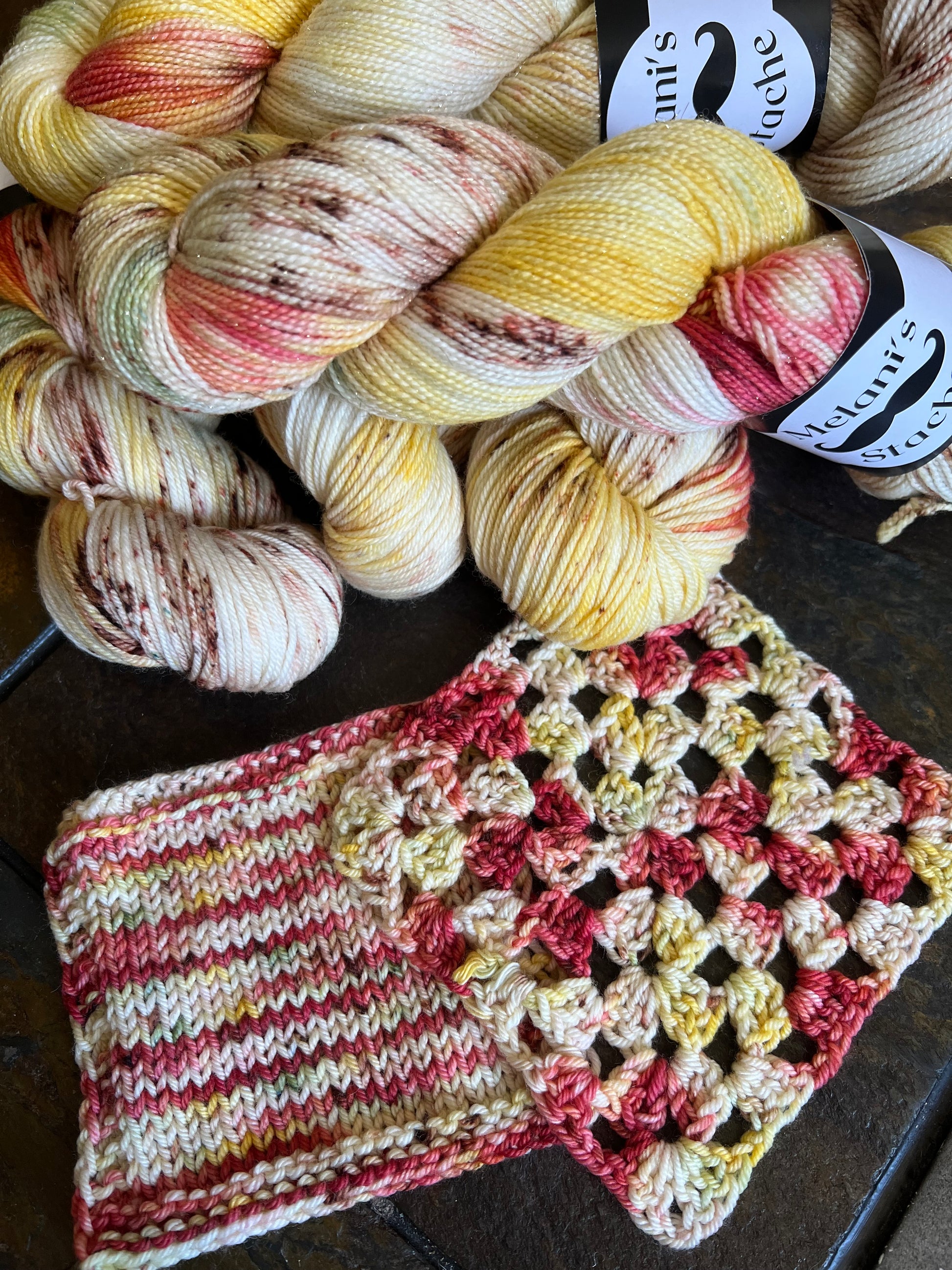 This hand-painted yarn is created by me using commercially processed yarn and high-quality acid dyes. I take steps to be able to recreate each colorway but consider each skein uniquely dyed. When creating multi-skein projects in the same colorway, I strongly recommend alternating skeins to make the colors blend as much as possible.